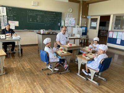 ふれあい給食二日目の紹介です。今日は2年生に教頭先生が,4年生に教務主任の千葉先生が,6年生に技師の熊谷さんが入り,会話を楽しみながらおいしい給食を食べていました。