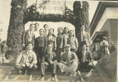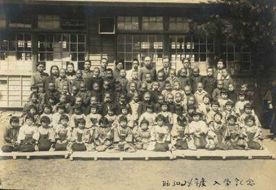 ↓ 中井小は昭和24年に「唐桑尋常小学校」の中井分教場から唐桑村立中井小学校として独立しました。独立の門制作の様子と、初代校長の小山孝平先生を中心にした記念写真。そして中井小学校記念すべき最初の入学生です。