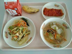今日の献立は気仙沼の食材によるものです。メカジキは気仙沼産,ドレッシングには大島のゆずを使っているそうです。
