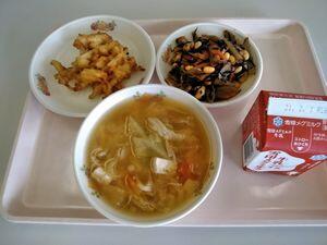 じゃがいもとさきいかの天ぷら 大豆の磯煮 きゃべつとえのきのみそ汁 牛乳