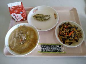 鮭のレモン風味 たけのこと水菜のシャキシャキサラダ 大根としめじのみそ汁 牛乳