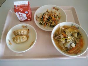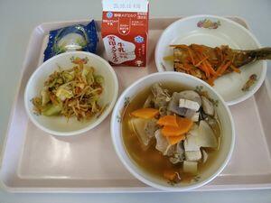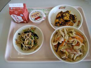 五目うどん 小松菜ともやしのおかか和え 大学芋 アセロラゼリー 牛乳