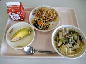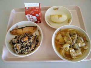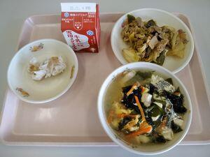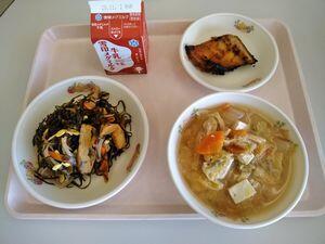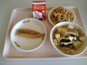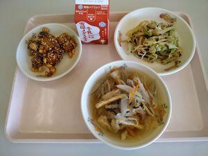 まぐろと大豆のごまがらめ キャベツのひじき和え 沢煮椀 牛乳