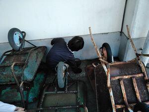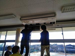 教室に設置されたエアコンのフィルター掃除。初めてだったので,みんなでやり方を確認しながら,各教室を回りました。