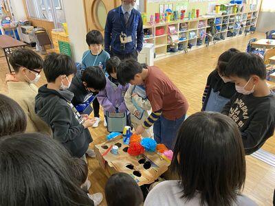 はじめに中井小学校の児童が,生活科の学習で町探検を行い、学んだことや感じたことを模造紙などを使って発表しました。次に,唐桑小学校さんで育てている鮭の稚魚を見せてもらったり,学習の成果を聞いたりしました。もぐらたたきゲームが楽しかったようです。