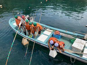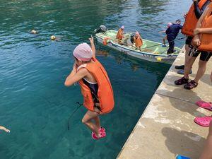 ↑全学年で海の浅瀬に入ってみました        ↑係留した船上でのウニ獲り体験