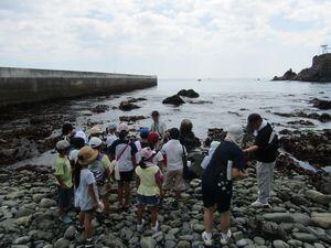 8月ではもっとも潮が下がるのが今日だということで,今日は,中井公民館の主催事業「なかいこども村」の第2回目「海にいってみよう」に参加してきました。中井小の1~6年生15名が参加しました。