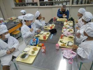 お世話になったガイドさんたちを囲んで,みんなで給食を食べました。5人のボランティアガイドのみなさん有り難うございました。