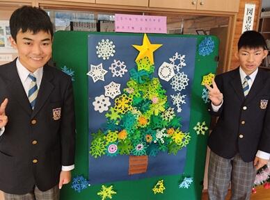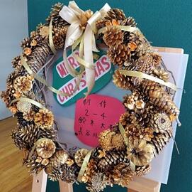12月15日(月)生徒昇降口と職員玄関を入ると,クリスマスツリーとひときわ輝くクリスマスリースが目にとまります。これは,2年4組の生徒が生活単元学習の中で作成した作品です。生徒に話を聞くと,ツリーの星を創るのが難しかったこと,リースは金色の絵の具で一つ一つの松ぼっくりを着色したことを教えてくれました。2025年も残りあとわずか。“師走”の忙しさに疲れもたまってくるこの時期に,クリスマスのワクワク感を感じながら,ホッと心が安らぐ空間になっています。中学校にお越しの際には,ぜひご覧ください。