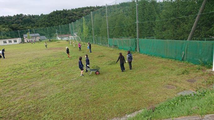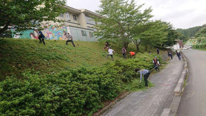 9月2日(土),朝6時から親子奉仕活動を行いました。朝早くから多くの保護者の方々と生徒たちに集合してもらい,1時間にわたり草刈り機械を使って学校敷地周辺ののり面等の草刈りと,校庭の草取り,草集めを行ってもらいました。今回は軽トラックのべ14台分の草が集められ,校地内がとてもきれいに整備されました。