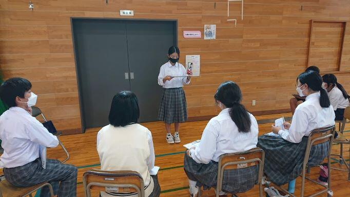 18日(土),気仙沼市平和学習報告会で,新月中学校代表生徒3名が「青少年ピースフォーラム(長崎県)への参加を通して」と題して発表を行います。その内容を15日の朝会で全校生徒にも伝えました。