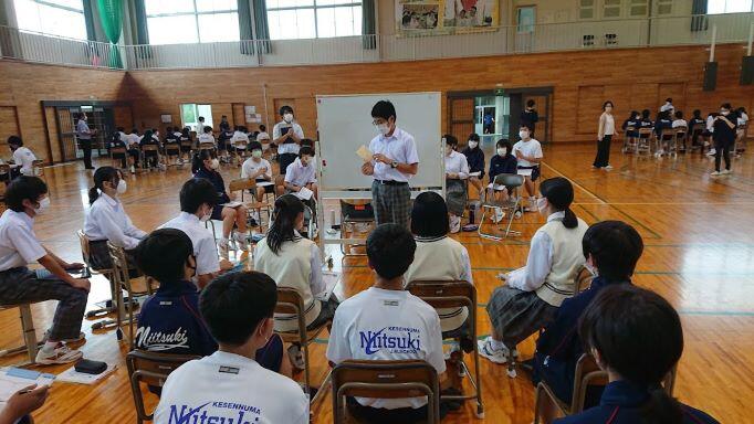 7月10日(月),生徒朝会が行われました。今回は,第9回みやぎ小・中学生いじめ防止動画コンクールに向けて生徒会執行部が制作し出品した動画の紹介が行われ,「いじめはどれだけつらく重いことなのかを考えながら見ていただけたら嬉しいです。」という執行部からの話の後,全校生徒で動画を視聴しました。