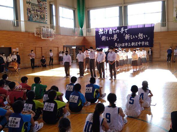 5月25日(木)地区中総体に出場する運動部を全校生徒で応援する壮行式が行われました。各部の選手紹介では,一人一人大きな声での返事と,応援団の元気のいいエールが印象的な,とても立派な壮行式となりました。大会当日は,自分の実力を最大限に引き出し,チームのため,そしてこれまで応援してくれた全ての人達のために,新月中の看板を背負って頑張ってきてほしいと思います。