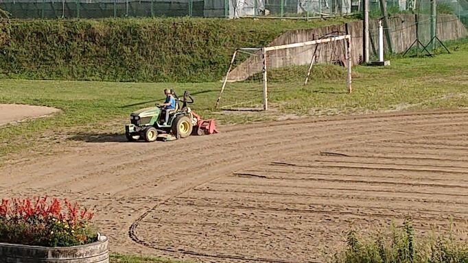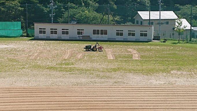 9月12・13日,昨年に引き続き新月中の元父母教師会長の小山さんにスポーツトラクタに乗っていただき,2日がかりでグランド整備作業をしていただきました。7月半ばから急速に生え広がった校庭の雑草はとても手強く,長いもので40㎝を超えるものもありました。 しかし,スポーツトラクタの後ろについた草刈りアタッチメントが回転し,根こそぎ雑草を抜き取ってくれています。
