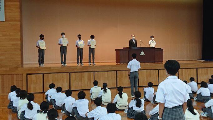 5月31日(水),地区中総体報告会と賞状伝達が行われました。報告会では,各運動部の部長から,中総体の試合結果の報告と,試合の様子,そして,これまでの思いや,後輩たちへのメッセージが述べられる大変素晴らしい会となりました。