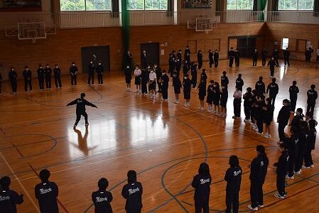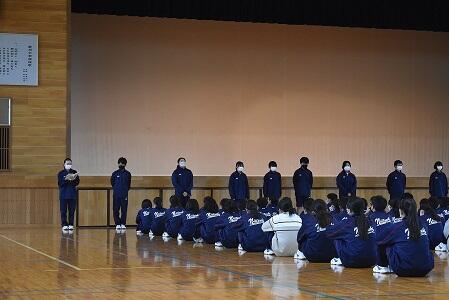 5月25日(木)地区中総体に出場する運動部を全校生徒で応援する壮行式が行われました。各部の選手紹介では,一人一人大きな声での返事と,応援団の元気のいいエールが印象的な,とても立派な壮行式となりました。大会当日は,自分の実力を最大限に引き出し,チームのため,そしてこれまで応援してくれた全ての人達のために,新月中の看板を背負って頑張ってきてほしいと思います。