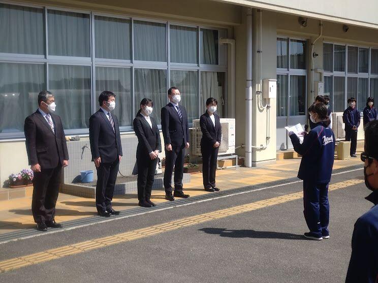 学校周辺の桜の木々が開花し始めた4月3日(月),生徒会が企画した令和5年度の新入職員出迎えの会が行われました。校旗を持った生徒会長に続き,校長先生を先頭に5名の先生方が新月中学校に着任しました。