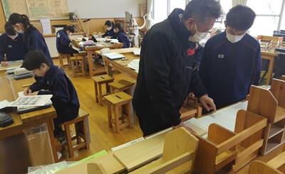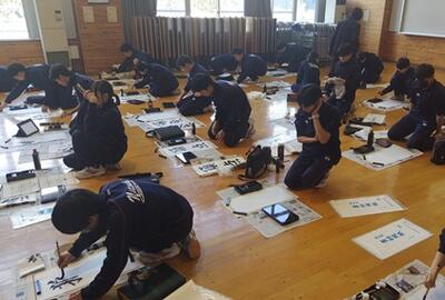 12月16日(火)今日の1時間目に3年生の習字の授業が最終回ということを聞き,お邪魔しました。3年間学んだことを生かして,最後は自分の好きな言葉を書に表しました(爆発,白米,寿司・・・など様々でした・・・)。そのまま,2時間目は1・2年生の授業を見学しました。1年生は英語と技術。技術は木工の本棚の設計でした。先生に質問しながら各々設計に取り組みました。生徒に「釘打ったことある? のこぎりは?」と聞いたところ,ほとんどが初めてだそうです。どんな本棚ができあがるのか完成が楽しみです。2年生は体育でした。バレーボールは今日から試合ということで,準備運動の時点からみんな張り切っていました。試合は思ったよりもボールがつながり,楽しんでプレーしていました。4組の生活単元学習では,自分でバケツで育てたお米を特別なビニールパックを使って湯煎して炊き上げ,おにぎりをつくりました。防災も意識した学習です。