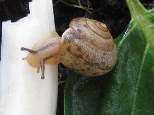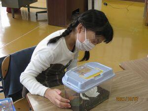 プランターの中で見つけたかたつむりが,外側に脱出しているのを発見ました。窓際にいて暑かったのでしょうか。ケースに入れてえさをあげ,しばらく飼うことにしました。おいしそうににんじんを食べていました。