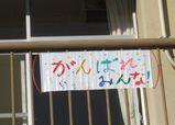 持久走大会でみんなを応援する横断幕を作りました。絵の具やクレヨンを使って楽しくできました。