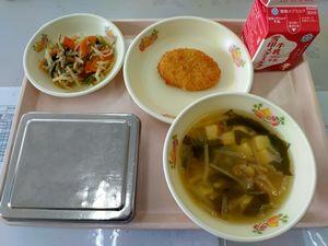 ごはん サケとキャベツのメンチカツ もやしと小松菜の炒め物 ホタテとワカメのスープ 牛乳