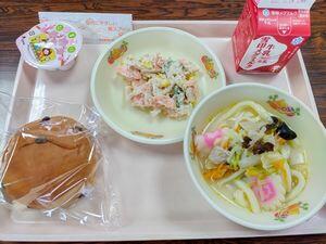 チョコレートパン ちゃんぽんうどん レンコンサラダ ひな祭りゼリー 牛乳