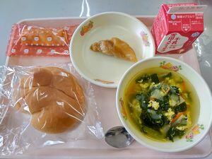 ココアパン チーズオムレツ 枝豆とチキンのサラダ トマトスープスパゲッティ 牛乳