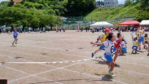 プログラム10番1年生の徒競走。呼名に対する返事も立派でした。プログラム11番4年生のゴールに向かってレッツ5!練習の時よりドリブルが上手になりました。