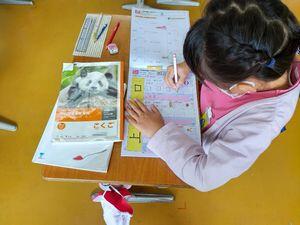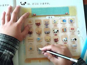 1年1組では教科書と同じ画像をパソコンからモニターに出力して子供たちに見せていました。「パンダは前から何番目?」「右から5番目の動物は何?」という問いについて子供たちは自分の教科書で調べ,発表された答えをモニターで確かめていました。