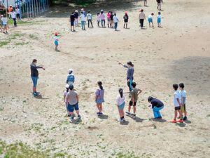 体育主任のR先生が事前に底にたまっていた汚泥を流していたので,作業は順調に進んだようです。