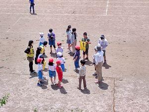 けいどろ,ドッヂビー,長縄飛びなど,15の縦割り班に分かれ,高学年が考えた遊びをしていました。戻ってきた1-2の男の子に何して遊んだのと聞くと「けいどろです。」と楽しそうに教えてくれました。