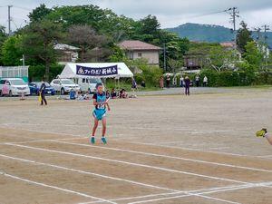 プログラム4番2年生のソーシャルディスタンスリレー春の陣,ゴムの切れるアクシデントもありましたが最後まで頑張りました。プログラム5番4年生の徒競走。ゴールの瞬間です。