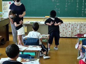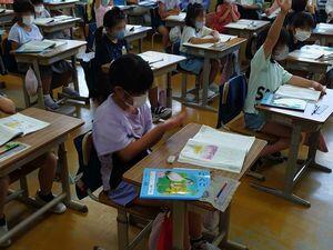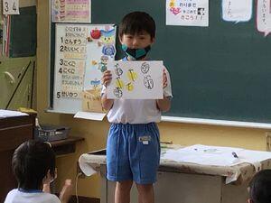 2校時,1年2組は算数の学習に取り組んでいました。問題は「女の子が3匹,男の子が2匹の金魚を水槽に入れました。金魚は合わせて何匹ですか。」です。