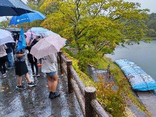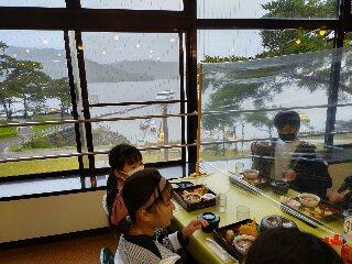 雨にかすむ桧原湖畔でお昼を食べました。これから帰路につきます。みんな元気です。