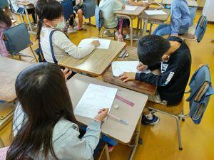 その後,「なりきり作文」を試しに書いてみました。お題は「自分の持っているものになりきって,持ち主の自分に向けて手紙を書こう」です。「わたしは○○。ご主人は□□君(自分)。□□君に言いたいことがある。」という書き出しでスタートです。子どもたちは「犬」「シャツ」「傘」「ソファー」「下敷き」「床」などいろいろなものになりきって楽しい作品を書いていました。書くことは自分と向き合い深く考えることで,子供たちに身につけさせたい力です。多作,楽作を通して書くことの楽しさを味わって欲しいと考えています。