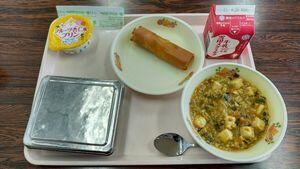 ごはん 春巻き 麻婆豆腐 フルーツ杏仁 牛乳