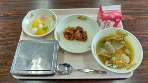 ごはん 鶏肉の唐揚げ ひじきの煮物 沢煮椀 牛乳