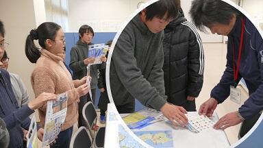 次に,海の市の事務所に向かい,おさんぽBINGOをどういう思いで作ったのか,どんな人達に使ってほしいのか,実物を使って紹介しました。子どもたちの思いが伝わり,特別にホヤぼーやショップに置いていただけることになりました。
