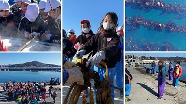 2月12日(水)4・5年生は面瀬川の河口,尾崎漁港にてワカメの収穫を行いました。11月に「種はさみ」をした小さな種が3ヶ月ほどで3m近くの大きなワカメの育っていました。マルセンワカメグループの皆さんに教えていただきながら,たくさんのワカメを収穫し,笑顔があふれていました。