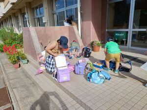 今日もその様子を見ていたのですが,子どもたちなりの工夫が見られて感心しました。健康観察カードをランドセルに入れておくと,左のようにランドセルを一旦下ろして中から取り出す工程が必要になります。