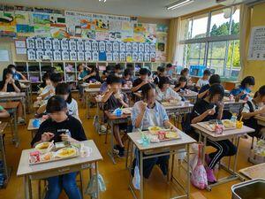 感染リスクが高いといわれる給食時間は,飛沫を飛ばさないように「黙食」に努めています。写真の6年生だけでなく,どのクラスも黙って食べていました。意識が高くすばらしいですね。