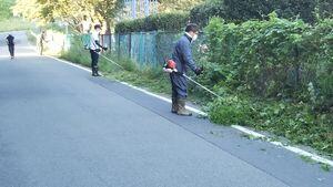 本日の作業の重点の一つは,通学路のガードレールの下から伸びた草です。草を避けて車道に子どもたちがはみ出して歩かないように,お父さんたちが草刈り機を使って刈ってくださいました。