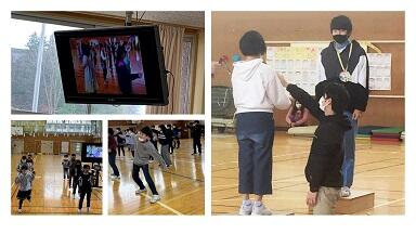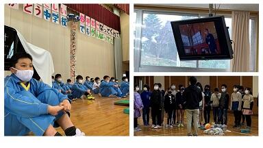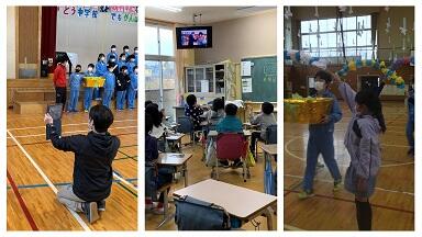 今年度は,感染対策のため,企画運営の5年生と出し物をする学年だけが6年生が待つ体育館に入り,他の学年は教室でZoom配信された映像を見て参加しました。