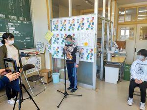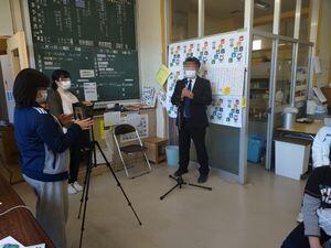 撮影は職員室の特設スタジオで行いました。今日の主役である6年生は音読の様子を事前に体育館で録画しており,それを特設スタジオで視聴した5年生の代表児童が感想を発表するという形です。