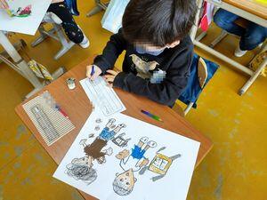 2校時,校舎を回っていると,2年2組は図工の勉強に取り組んでいました。どんなテーマですかと聞くと,自分の好きなことを描いているとのこと。作品のいくつかを紹介します。