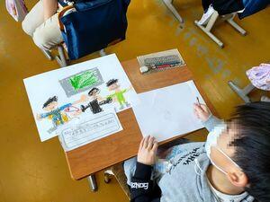 校庭の桜の木の下で遊んでいるのでしょうか,ピンクで表した花がきれいです。担任のR先生は教室を回り,「水族館だね,いいねぇ」「様子がよく分かるよ」と一人一人に声を掛けていきます。