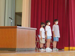 10月10日(金),1学期終業式が行われました。業前にテレビ放送で行ったのですが,各学級から校歌のきれいな歌声が聞こえるなど,子供たちはしっかりとまとめの行事に取り組みました。今回,作文の代表は,2年生と5年生。「算数や国語を頑張った」「委員会活動や野外活動を頑張った」など,二人とも心を込めて発表してくれました。