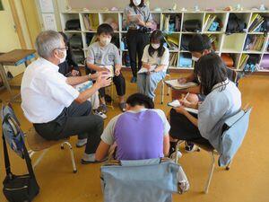 また,5年生は6月17日(火)に八瀬森の学校の田村様より,山の働きと森川海のつながりについて御講話をいただきました。子供たちは,お話を聞くことで,5月に行った岩井崎での生き物調査と昨年度までの面瀬川での生き物調査活動とを結び付け,森と海をつなぐ面瀬川の大切な役割に気付くことができました。