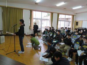 2月13日木曜日,東日本大震災後から子供たちと一緒に絵を描くなど,支援活動を続けている神戸市の造形絵画教室「アトリエ太陽の子」を主宰する中嶋洋子先生が来校し,絵本を寄贈してくださいました。中嶋先生は,東日本大震災後に本校にも支援に訪れ,当時の子供たちと一緒に大きな桜の木を描いてくださいました。今回は絵本をとおして,命の大切さを伝えてくださった中嶋先生です。代表で受け取った図書委員の二人は,自分たちで文章を考え,早速,昼の放送で全校に紹介してくれました。