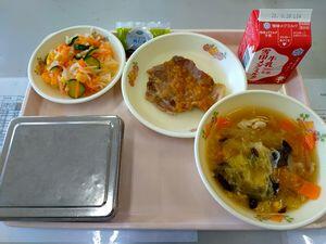 ご飯 鶏肉のトマトソースがけ ひじきのサラダ 野菜と豆のスープ 牛乳